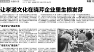 2014年1月24日,以曉芹企業(yè)孝道、感恩文化為主題,半島晨報(bào)社區(qū)報(bào)做了詳細(xì)報(bào)道“孝道文化”建設(shè)傳播王曉芹董事長(zhǎng)對(duì)員工常掛在嘴邊的一句話說(shuō)的好:“人的一生有三件事情不能等:學(xué)習(xí)不能等,健康不能等,孝敬不能等?!逼鸪?,王總基于自己個(gè)人情懷最先將孝道文化引入公司…