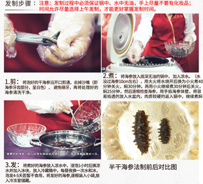 2.如果感覺(jué)海參海參微涼,請(qǐng)將開(kāi)袋后的海參重新放到溫水中熱一下,切忌滾熱的開(kāi)水。